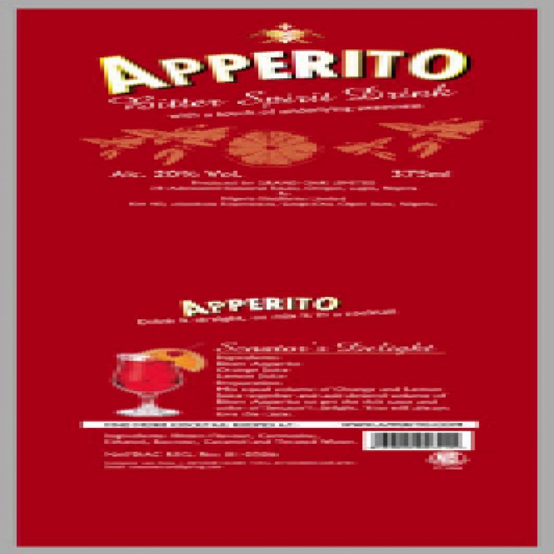 Apperito is a red bittersweet beverage. It is a bitter aperitif with a touch of underlying sweetness, encased in a beautiful flint bottle. Serves well;