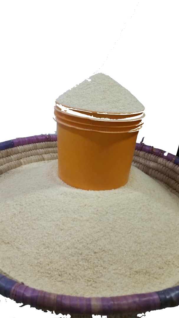 A more appropriate English name for garri will be granulated cassava or cassava granules. Coarse-grained cassava also works.
